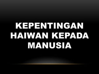 Kepentingan haiwan kepada manusia sumber pengajaran. Ada haiwan ternakan diternak secara. Pelbagai jenis flora dan fauna.